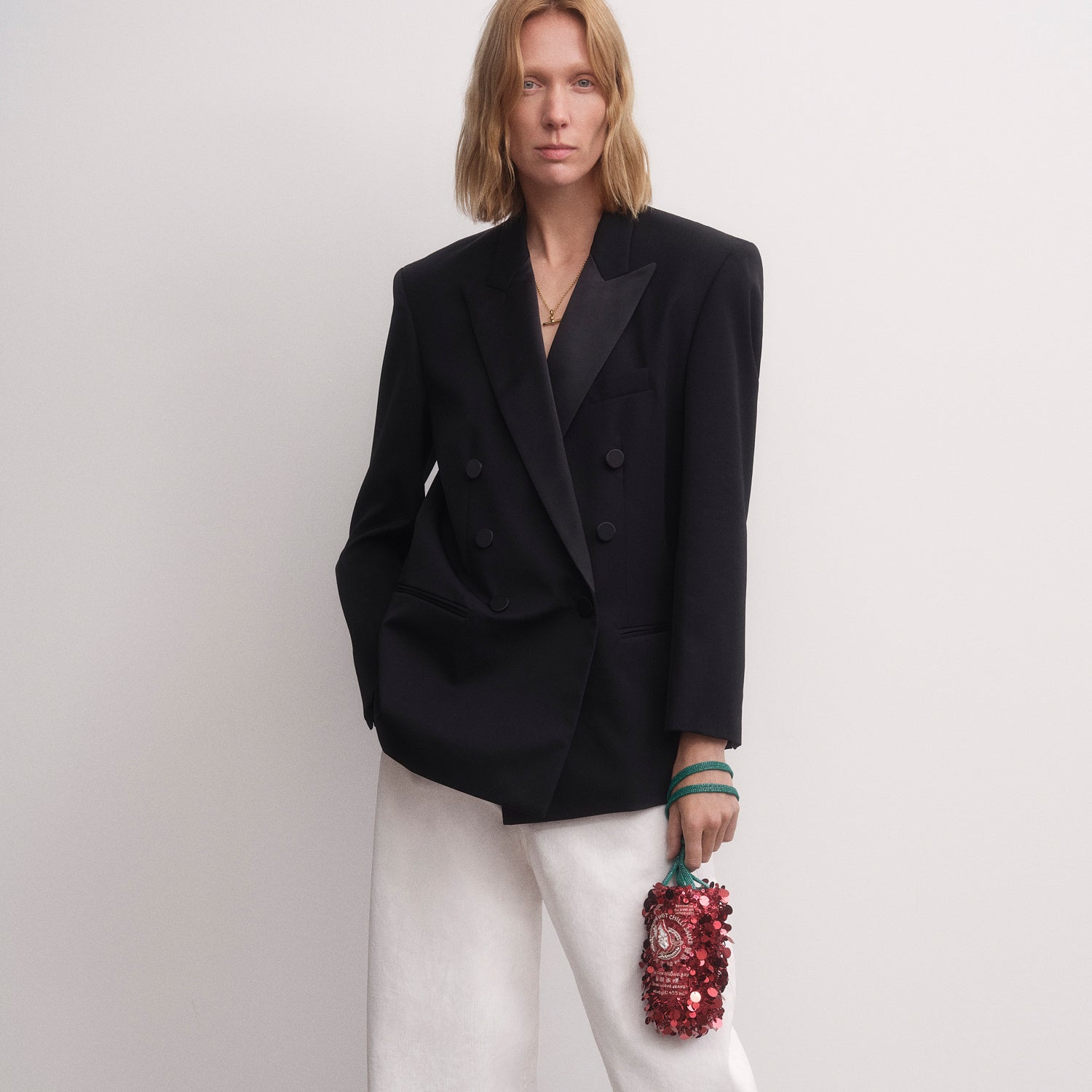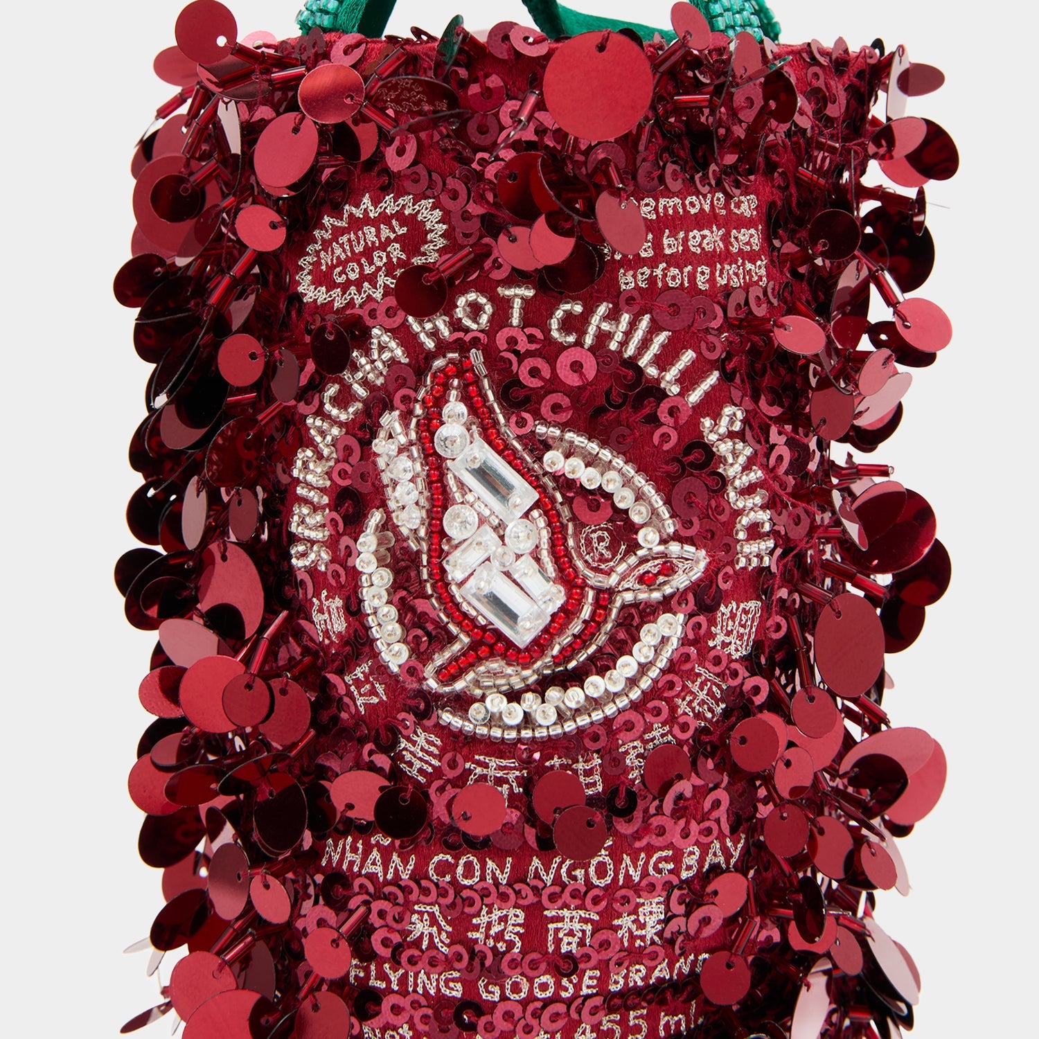 サテンのベースにスパンコールとビーズで描き出したのは、タイ産の「シラチャ」ソースのパッケージ・デザイン。ボトル・キャップのグリーンにちなんだハンドルには、クリスタルで装飾を施しています。内部は、スマートフォン、カードケース、リップスティック⋯⋯パーティーに必要なものがすんなりと収まる容量です。