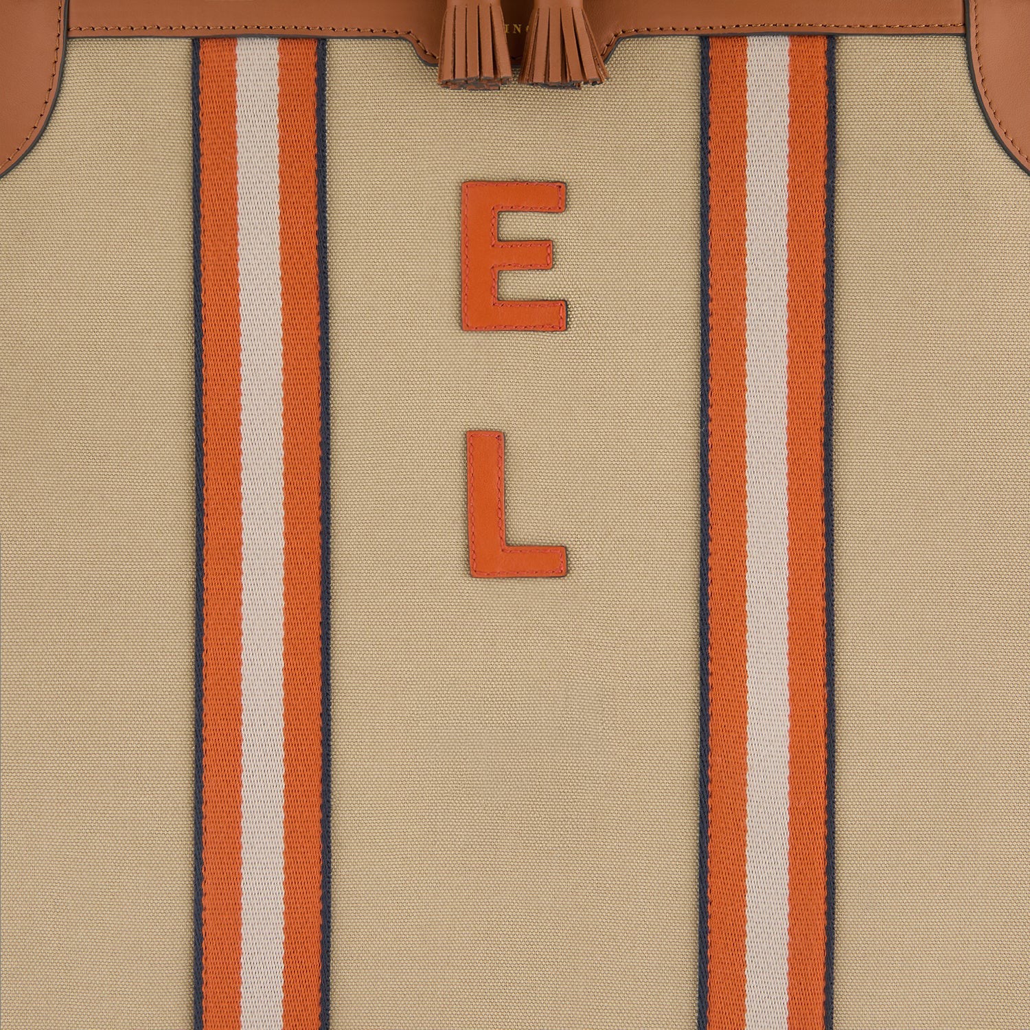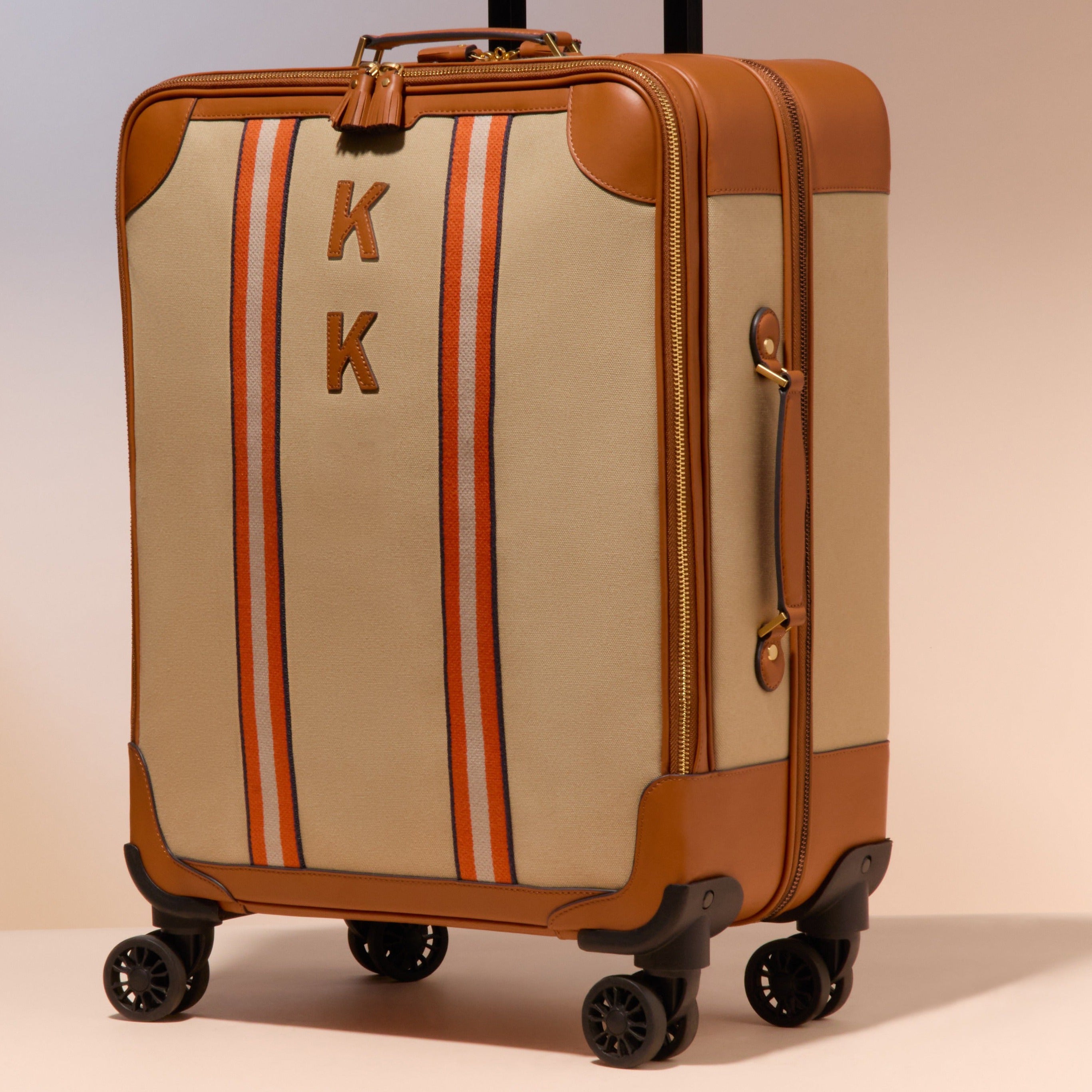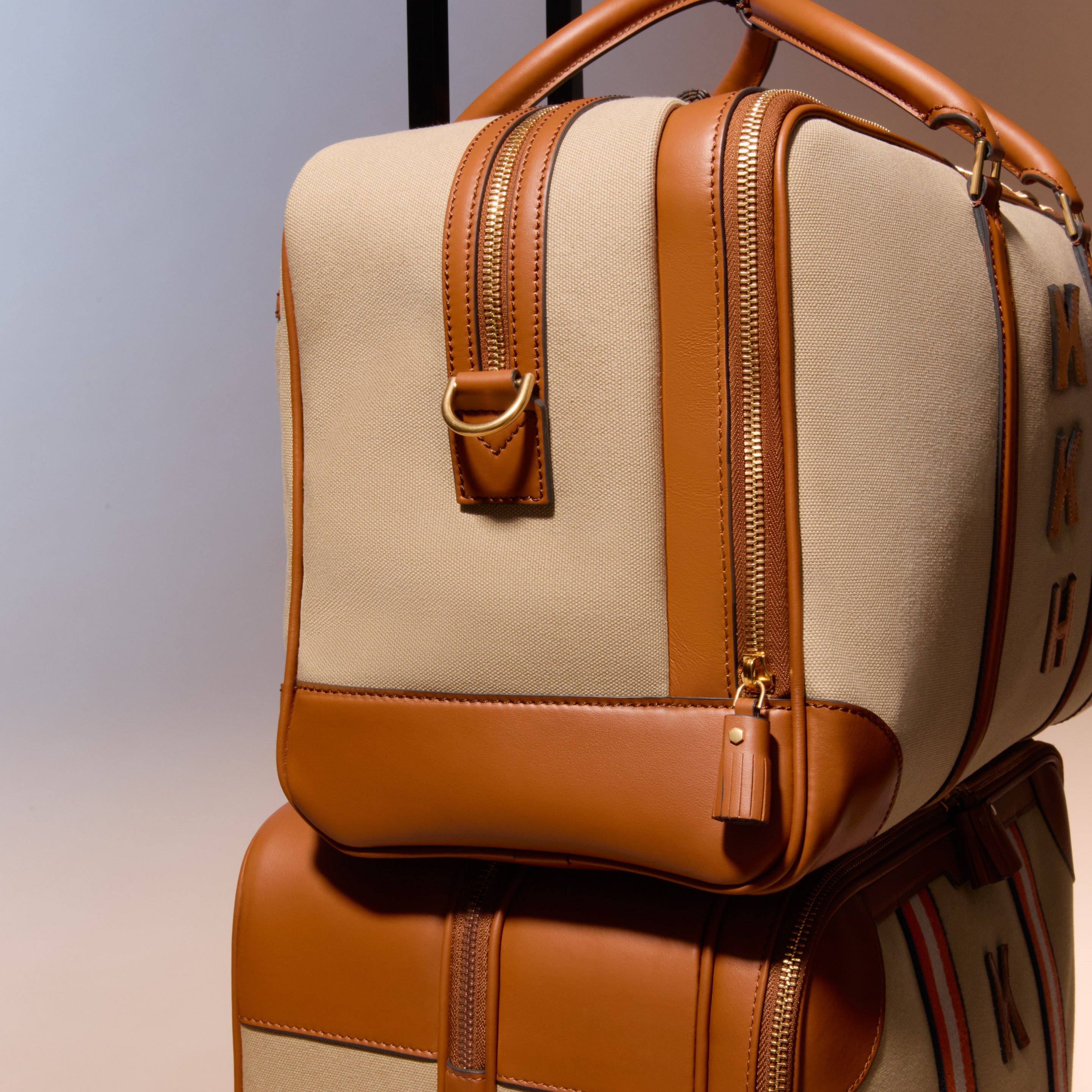 古き良き時代を思わせるルックスながら、現代の旅にフィットするスーツケースです。軽いキャンバスを用い、レザーでトリミングを施しました。前面のファスナーを開けると、ラップトップやケーブル、パスポート、カードなどの指定席が。メインのコンパートメントも、すでに着用したもの、これから着用するものを分けて収めることができます。前面にはモノグラムを加えて、レザーの「タブ」にお名前を印字してのパーソナライズが可能です。