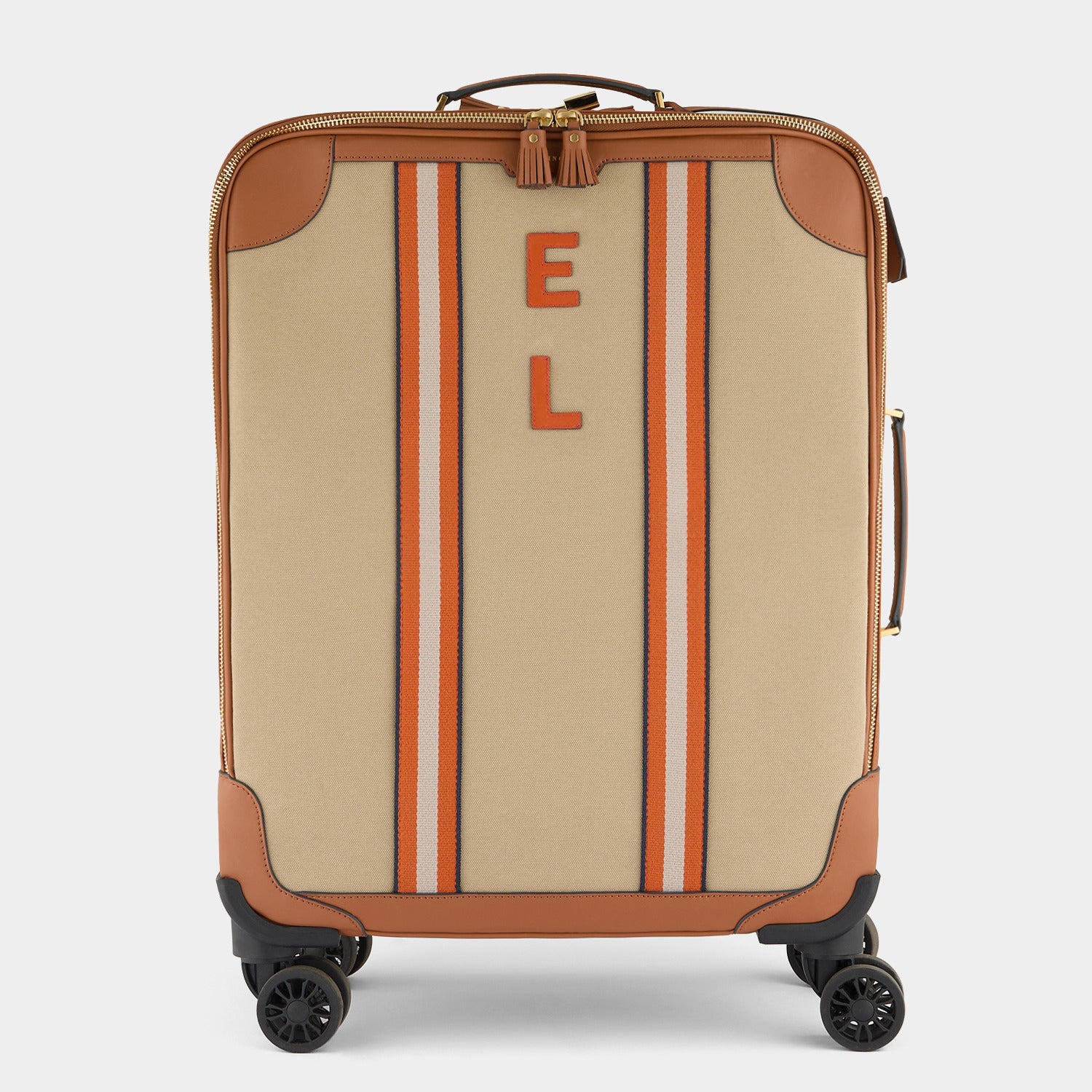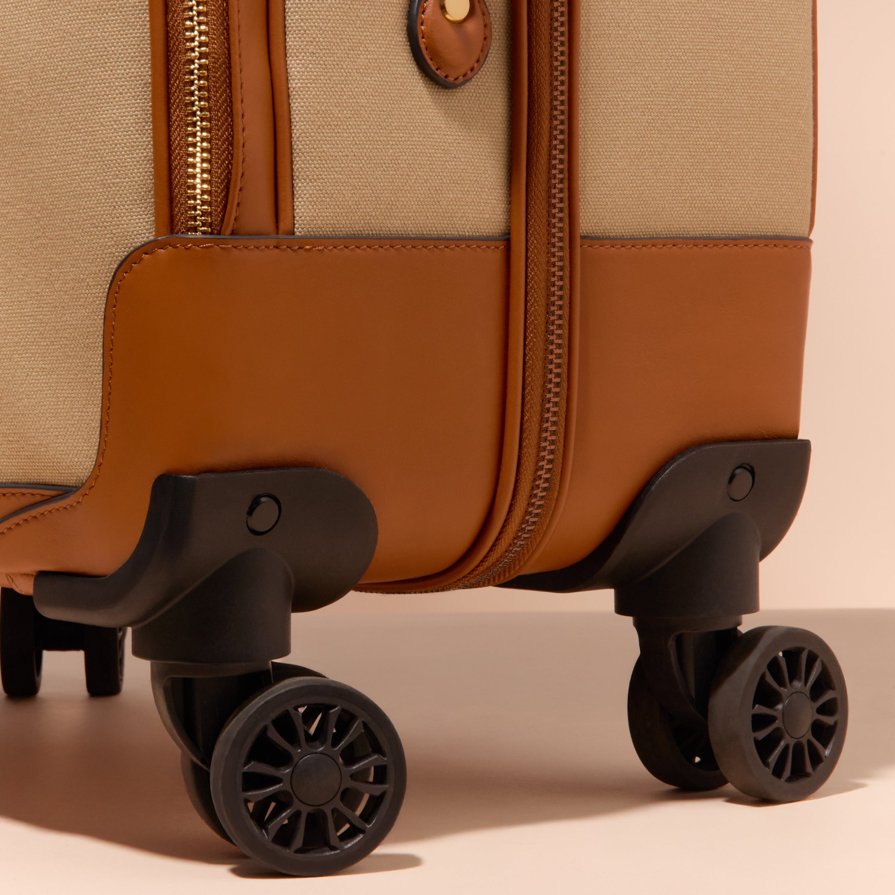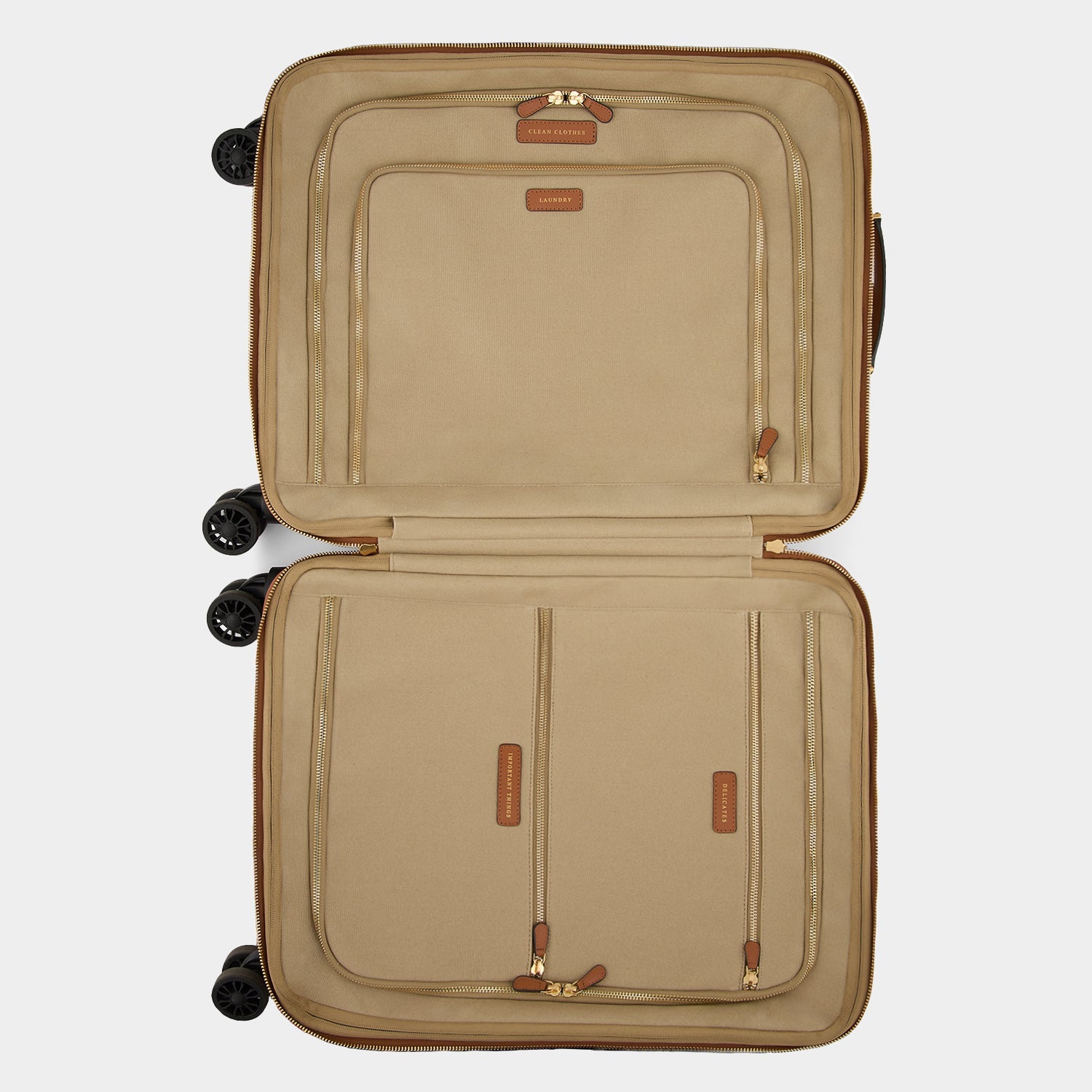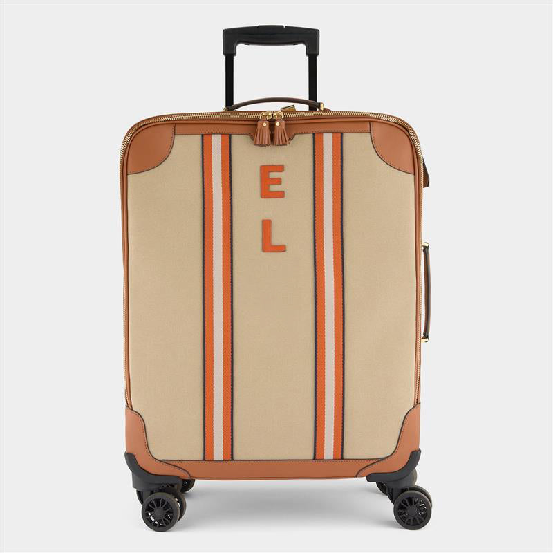 古き良き時代を思わせるルックスながら、現代の旅にフィットするスーツケースです。軽いキャンバスを用い、レザーでトリミングを施しました。前面のファスナーを開けると、ラップトップやケーブル、パスポート、カードなどの指定席が。メインのコンパートメントも、すでに着用したもの、これから着用するものを分けて収めることができます。前面にはモノグラムを加えて、レザーの「タブ」にお名前を印字してのパーソナライズが可能です。