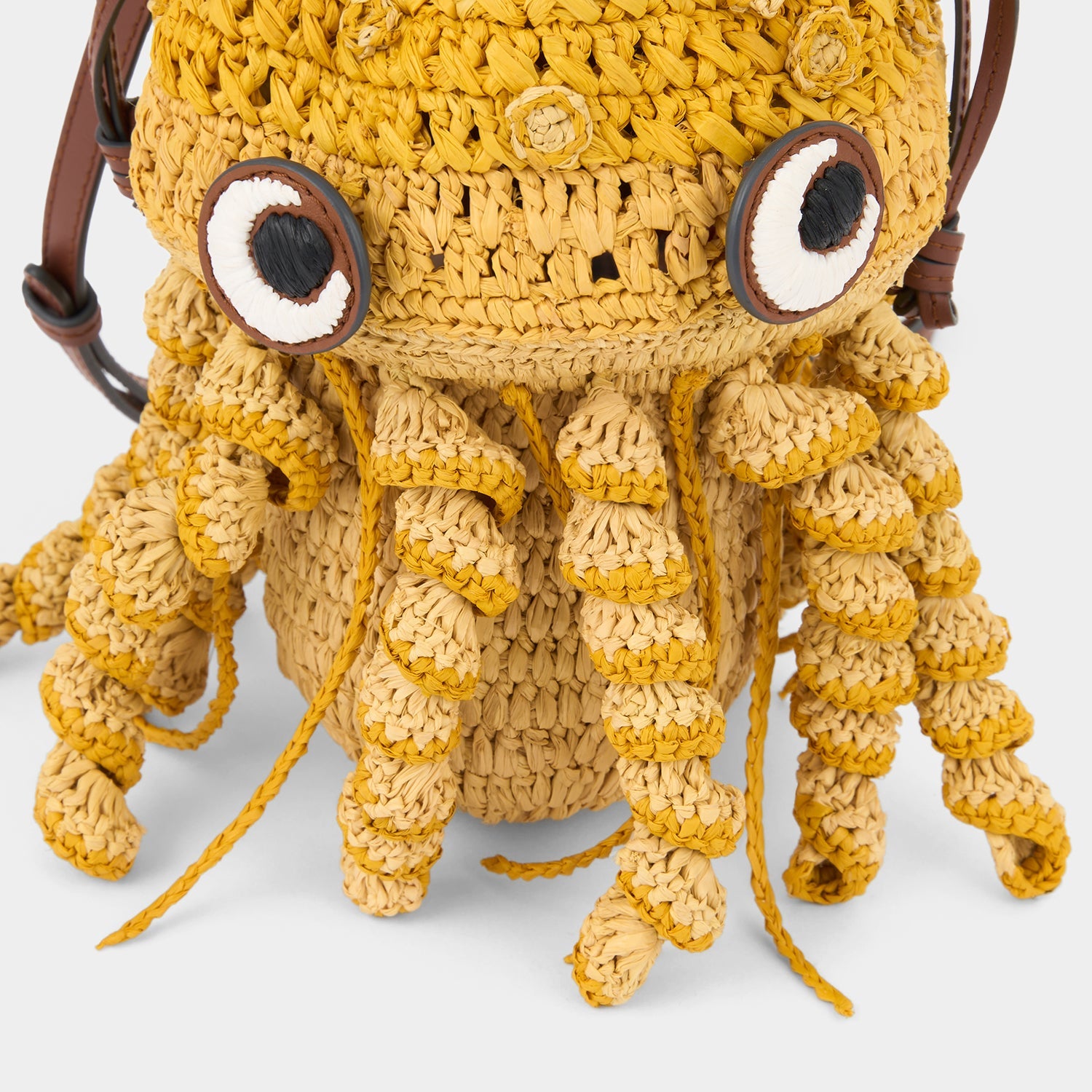 ラフィアを編み上げたバスケット・バッグには、ひねりを加え、ちょっと不思議な「海の生きもの」をかたどりました。開口部にはドローストリングをあしらい、トップ・ハンドルで手に提げて、着脱可能なストラップでクロスボディに、とお使いいただけます。