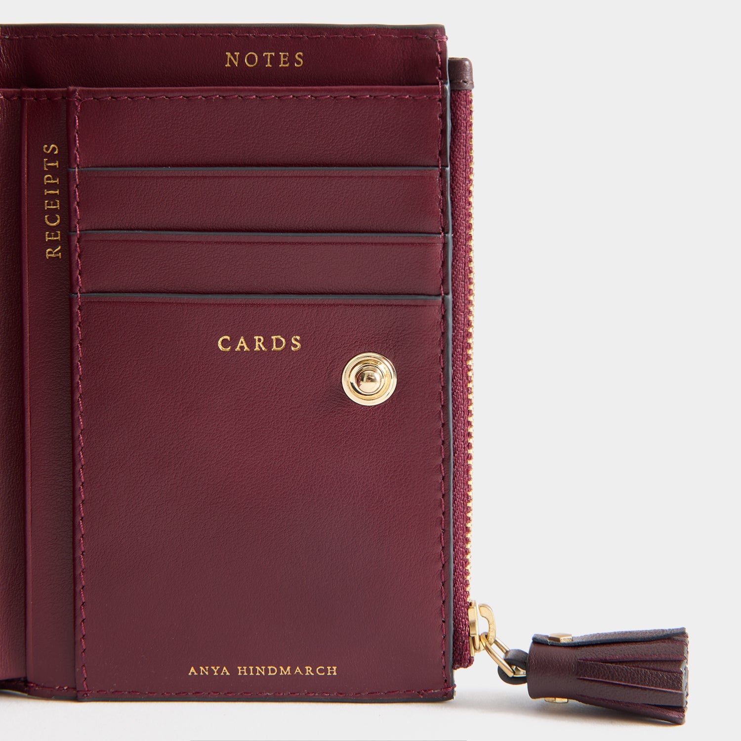 両サイドの、タッセルの付いたファスナーで開閉する2つのコンパートメントには、コインを。紙幣、カードのスロットに加え、「receipts」「tickets」と印字したスロットもあります。向かって左のコイン用コンパートメントには、よいことがありますように、と「ラッキー・ペニー」の刻印を添えておきました。