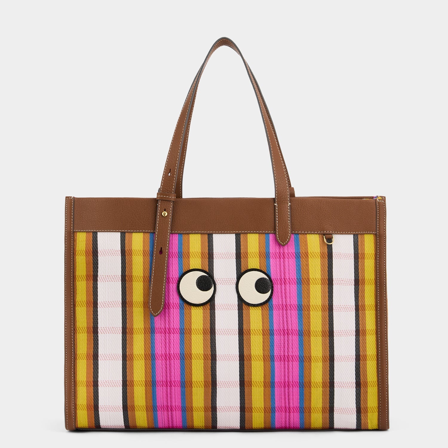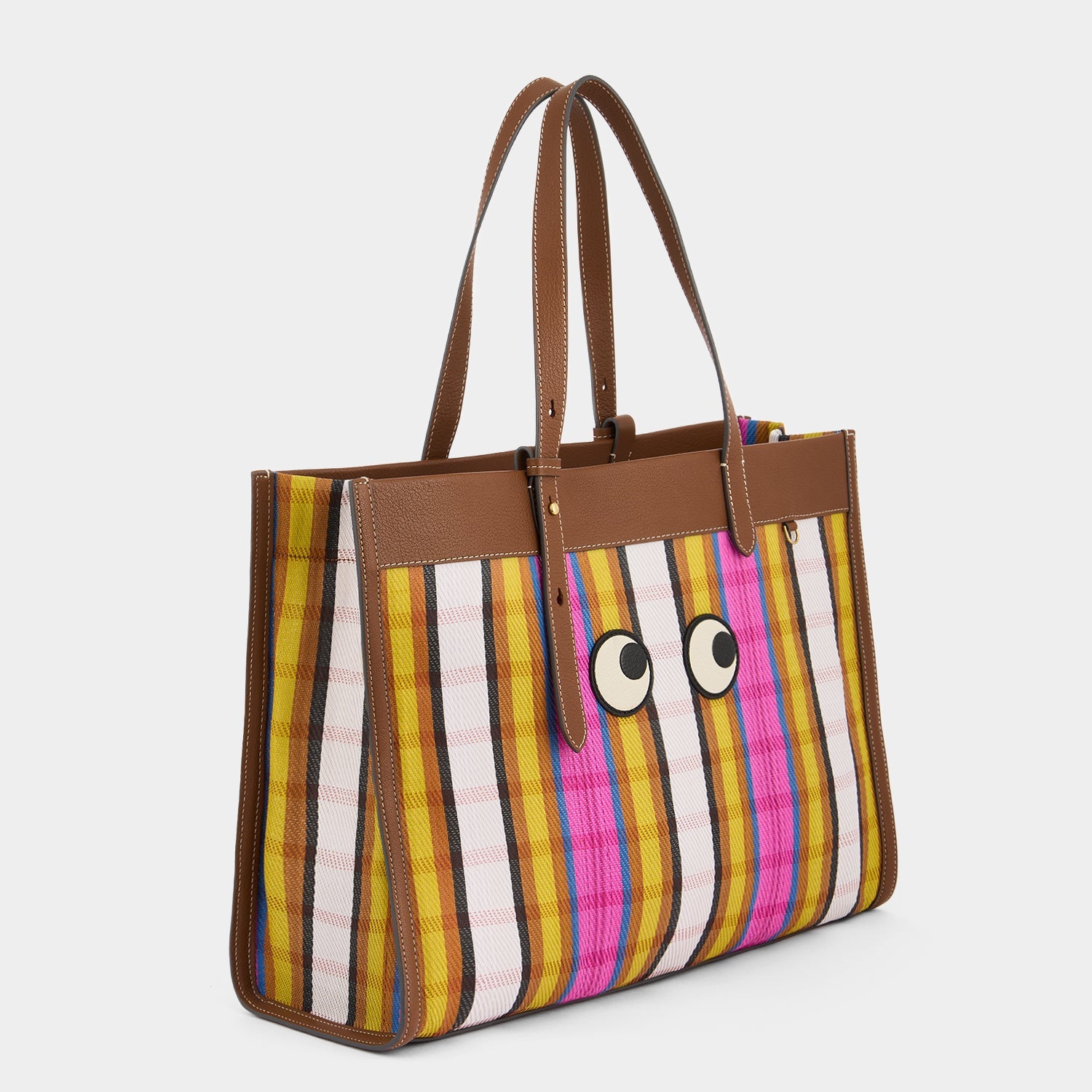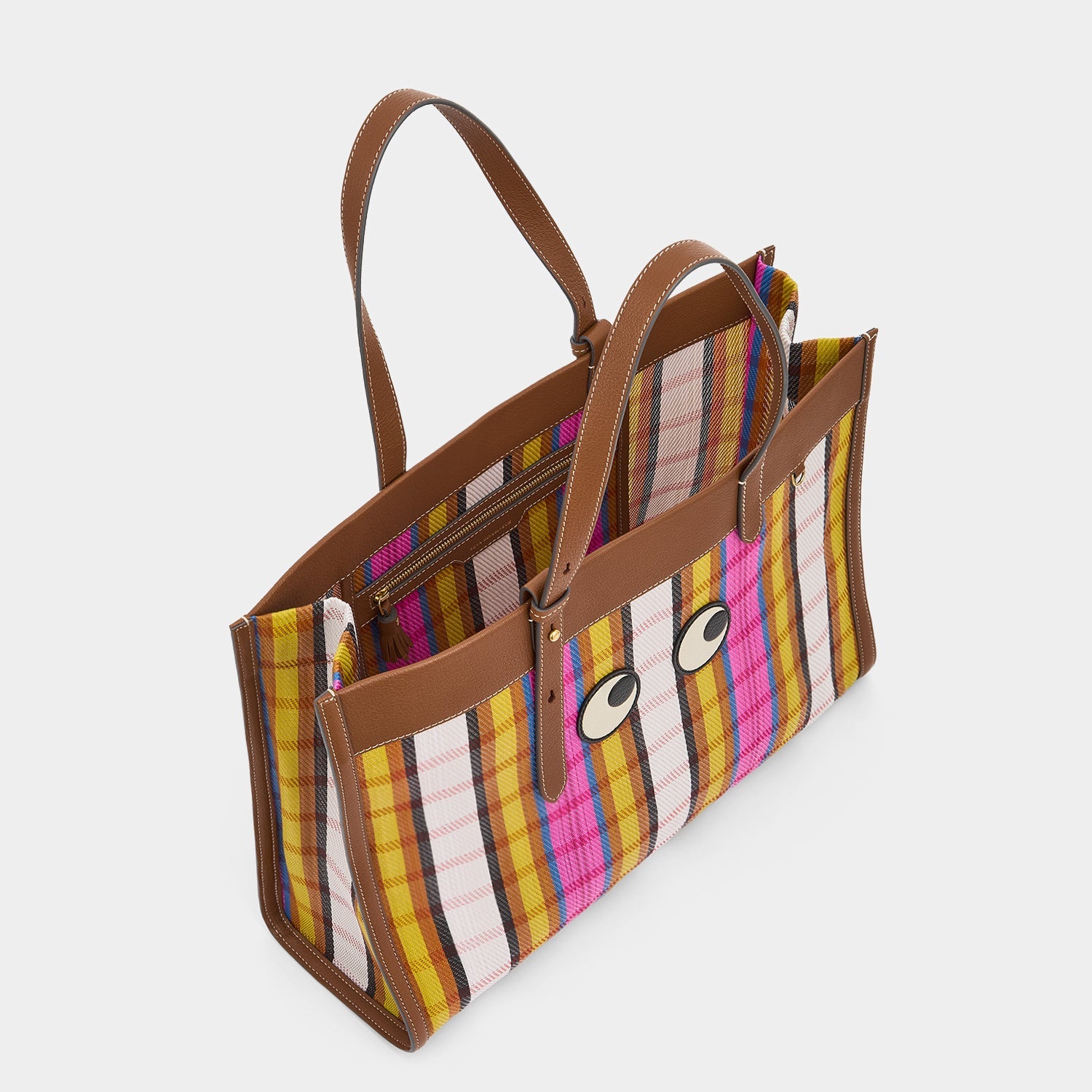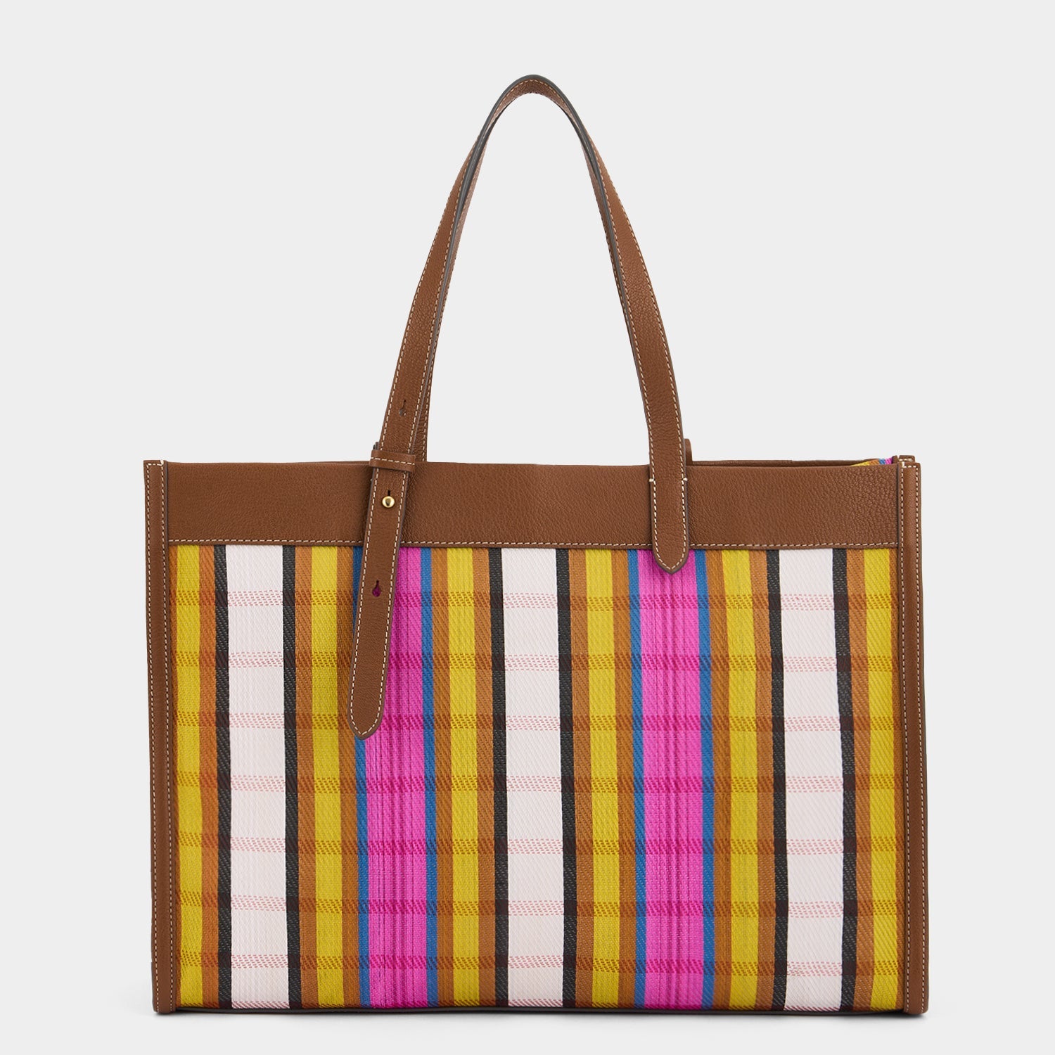 再生プラスチックから生まれたストライプのファブリックを用いたトート、ハンドルとトリミングにはヤギ革を用いました。ラップトップやノート、メークアップ用品まで、日々必要なものをなんなく収めることが可能、細々としたものは内部のファスナー付きのポケットへどうぞ。ハンドルは、使いやすい長さに調節が可能です。