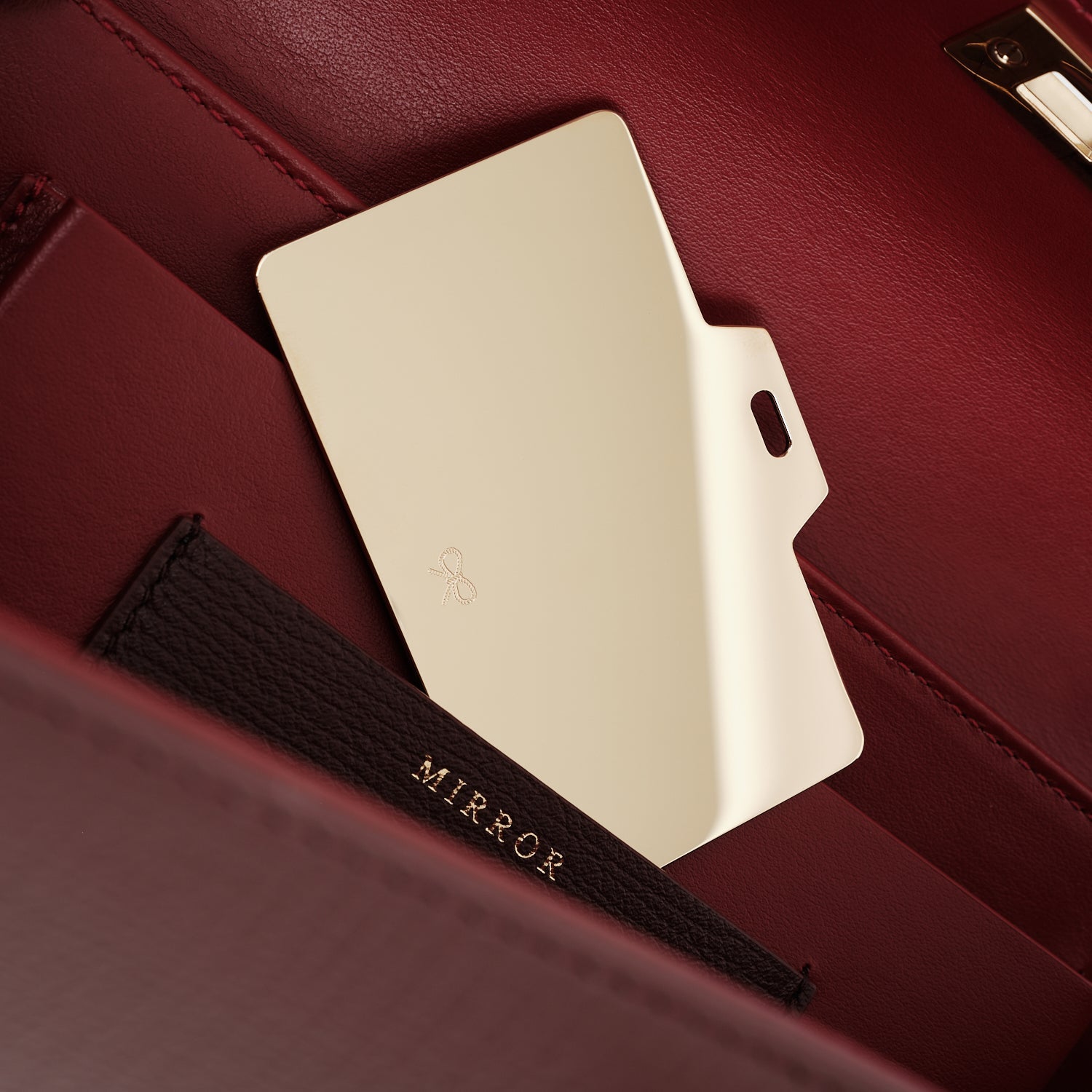 素材として用いたレザーは「Leather Working Group」の認証を受けた光沢のあるカーフ、その表面に型押しを施し、フィレンツェの工房でていねいに仕上げられます。内側はサテン・レザーでライニングを施し、スマートフォンが納まるポケット、リップスティック用のコンパートメントのほか、「Mirror」と印字したスロットにはゴールド・トーンに輝く「鏡」もご用意しました。トップ・ハンドルでクラッチとして、また付属のストラップで肩から提げてとお使いいただけます。