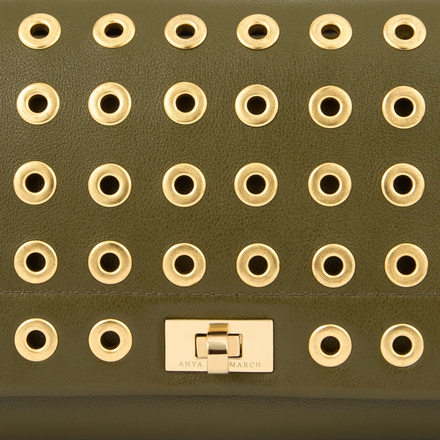 落ちついたグリーン(ボンサイ・グリーンと呼んでいます)の光沢のあるカーフは、「Leather Working Group」の認証を受けたもの。その表面を、規則正しく並んだアイレットが飾ります。トゥイスト・ロックを開けてアクセスする内部には、お財布やスマートフォン、メガネケースやメイキャップ用品などがすんなりと収まるスペースを確保しています。