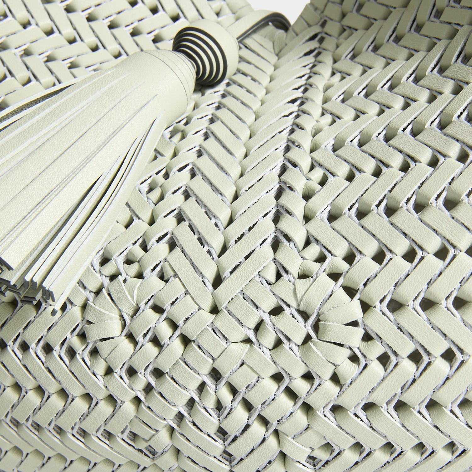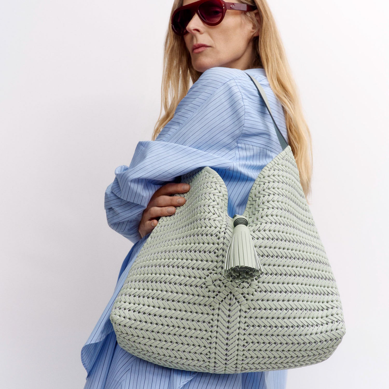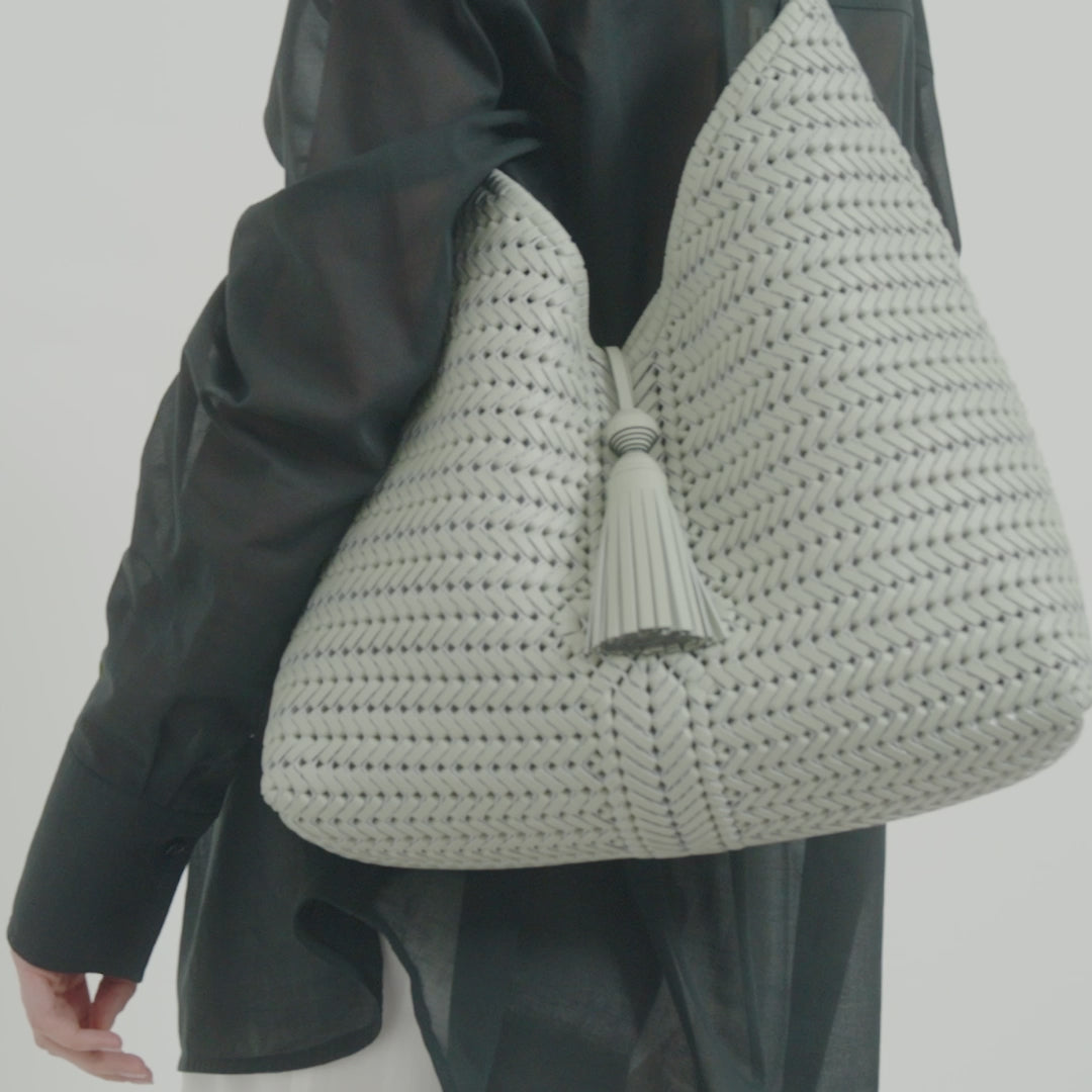 レザー・ストリングスをていねいに編み込んだ仕上げの美しさと、日々必要なものをなんなく持ち運べる機能性、その2つを両立させたホーボー・バッグです。大ぶりのタッセルとマグネットで開口部を開閉することができ、容量はたっぷり、内部には細々としたものを収めることのできるポケットをご用意しています。ハンドルは使いやすい長さに調節でき、Dリングにチャームを加えることでパーソナライズが可能です。