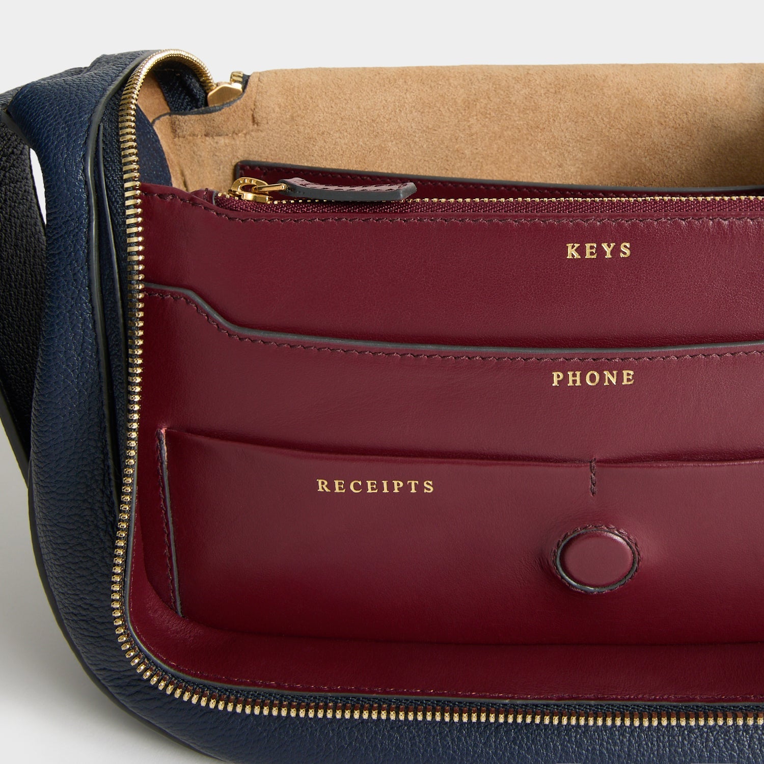 - 内に「KEYS」「PHONE」「RECEIPTS 」「CARDS」ラベル付きポケット