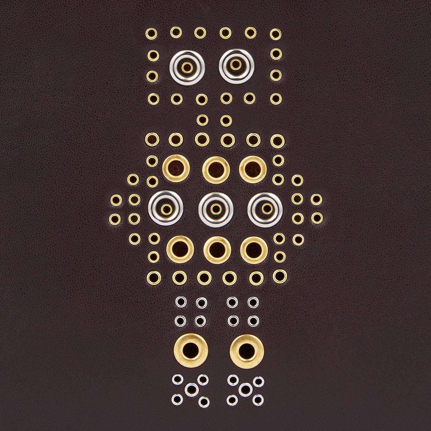 「Leather Working Group」の認証を受けたナッパ・レザーを用いたルースポケット。表面には、アイレットを用い描いた謎の人物(?)が浮かびます。日々必要な細々したものをここに収め、大きめのバッグにしのばせるという使い方がおすすめです。